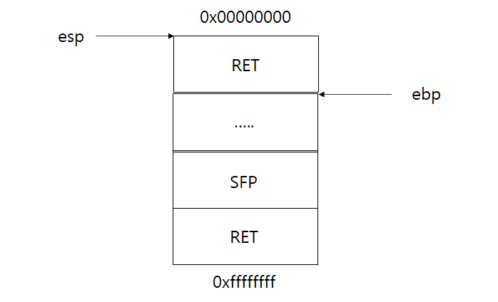- mov ebp, esp를 통해 스택정리 후 ebp와 esp의 위치를 같게만듬 이로서 스택의 최상단에는 SFP 존재