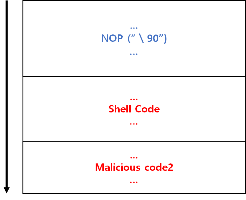 - Shell Code의 주소를 정확히 알아내기 힘들 경우 큰 메모리를 확보하여 Shell Code의 주소의 오차 범위를 크게 만들 때 사용.