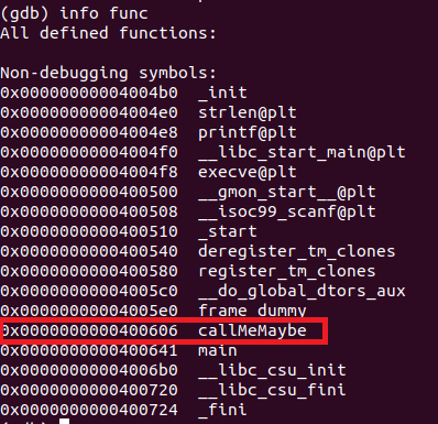 그렇다면 돌아가서 메인함수에서 scanf를 사용하니 저기서 버퍼오버플로우를 이르켜 ret에 해당 callMeMaybe 함수의 주소를 넣으면 해당 함수를 실행시키며 쉘이 실행 될 거 같다. 일단 시도해보자