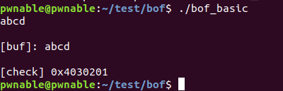 0x34와 0xc의 오프셋 위치를 구해 거리 차이를 구하였다. 0 xffffd07c를 보면 0x04030201이 입력되어 있는 걸 볼 수 있다. 이로서 거리는 40바이트의 거리가 있고 그 후 0 xffffd07c부분에