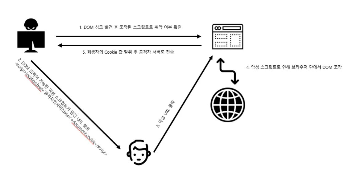 - 일반적으로 JS가 URL과 같은 소스에서 데이터를 추출하여 innerHTML과 같은 속성을 사용하여 동적 코드를 실행할 때 발생한다 이를 통해 공격자는 악의적인 JS 를 실행할 수 있다.