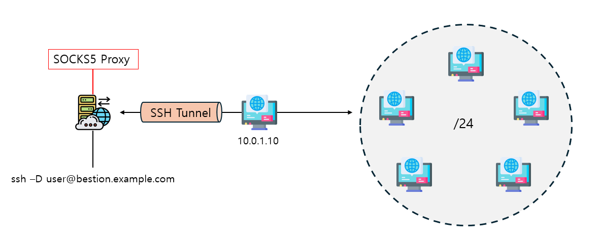 위 사진과 같이 로컬 머신에서 베스천 호스트로 SSH 접속을 수행하면서 -D 옵션으로 SOCKS5 동적 포트포워딩을 활성화 한다.
