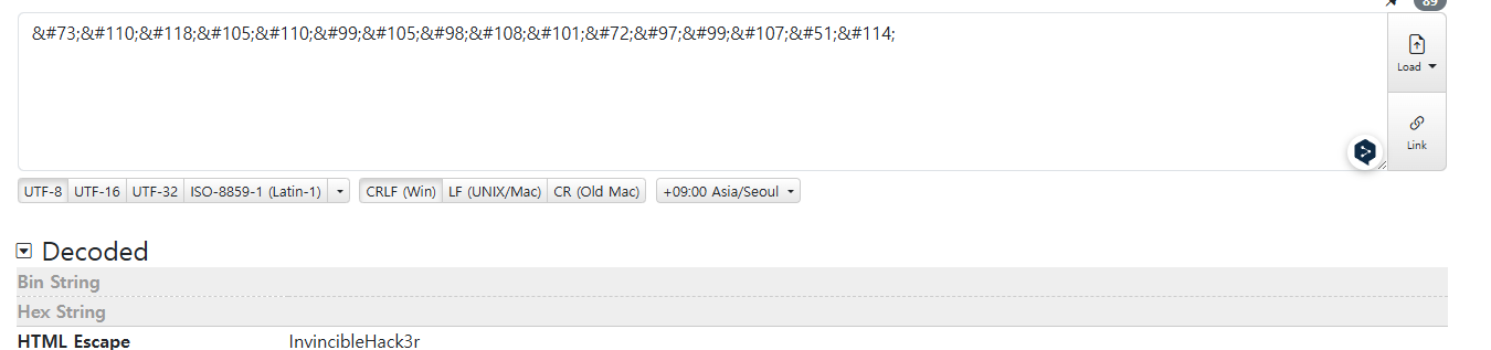 디코딩 결과 InvinibleHack3r 라는 패스워드로 추정되는 값 을 획득했다.