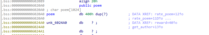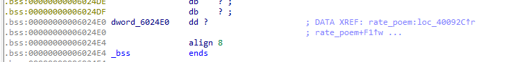 poem과 unk_6024 A0 둘 다 변조시켜야 할 값과 같은 bss영역에 존재하므로 bof를 통해 dword_6024E0의 값을 변경하면 된다는 것이 확실해 져싿