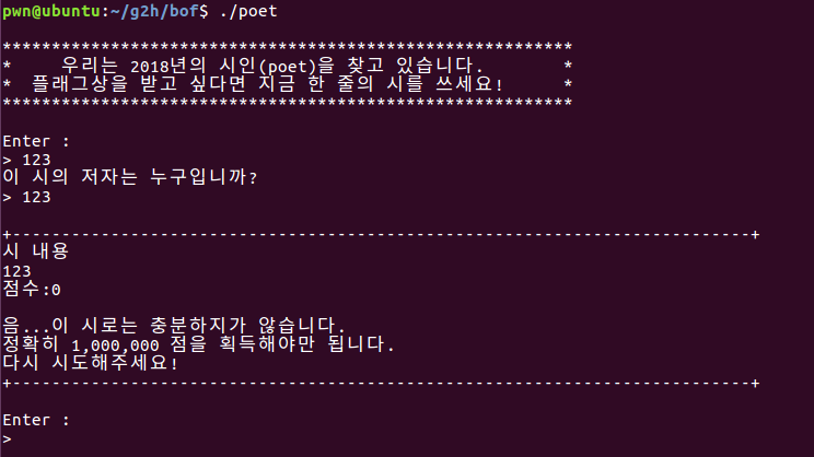이번에 풀어볼 문제는 Hackctf에 Poet 문제 일단 해당 문제를 실행시켜 보았다.
