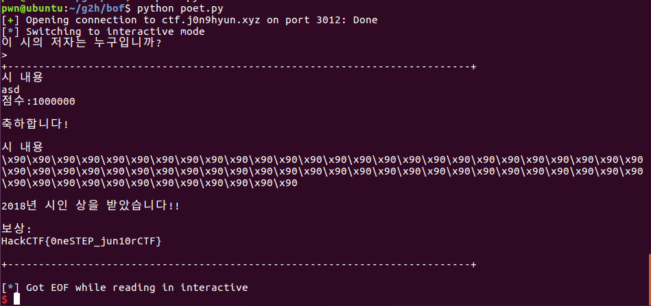 첫 번째 입력받는 부분에서 임의의 값을 보낸 후 그 후 페이로드를 보내 공격하도록 작성하였다