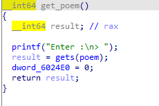 먼저 get_poem함수를 보면 입력을 받을 수 있도록 gets를 통해 poem에 입력을 받는다 여기서 bof가 일어날 수 있다
