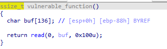 vulnerable_function함수에서는 136만큼의 buf변수를 선언하고 read함수를 통해 0x100(256)만큼 입력을 받는다