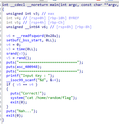 서버의 시드값으로 설정된 rand난수 값과 우리가 입력하는 값을 같게 해 주면 된다. 여기서 어떻게 같아지는 거지?라고 생각했지만 역시나 단순했다 해당 문제의 시드 값으로는 time함수를 통해 현제까지의 시간을 시드 값으로 넣고 있었다