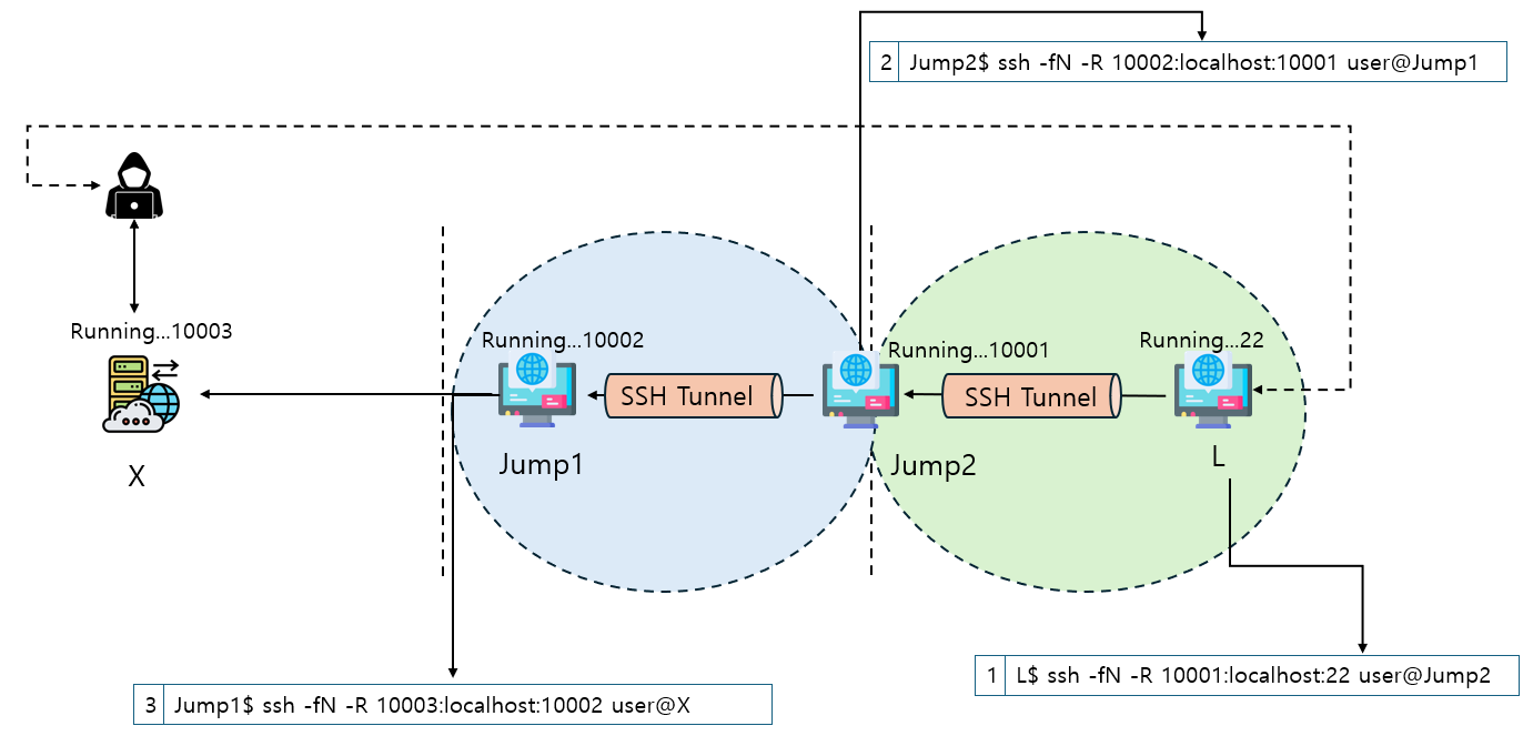 이와 같이 3단계 역방향 터널을 순차적으로 열어두면, 최종적으로 외부 SSH 서버 X의 포트 10003에 들어오는 연결은 Jump1의 10002를 거쳐 Jump2의 10001로 흐르고, 거기서 다시 내부 서버 L의 22번 포트(SSH 서비스)까지 도달하게 된다.