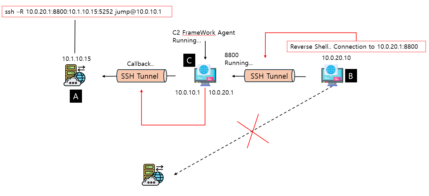 이러한 망분리/차단 환경에서 공격자 A는 중간 매개 서버 C의 도움을 받아 Reverse SSH 터널을 구축함으로써, 결국 외부에서 SSH, RDP, 웹서비스 등 B의 내부 자원에 접근할 수 있게 된다.