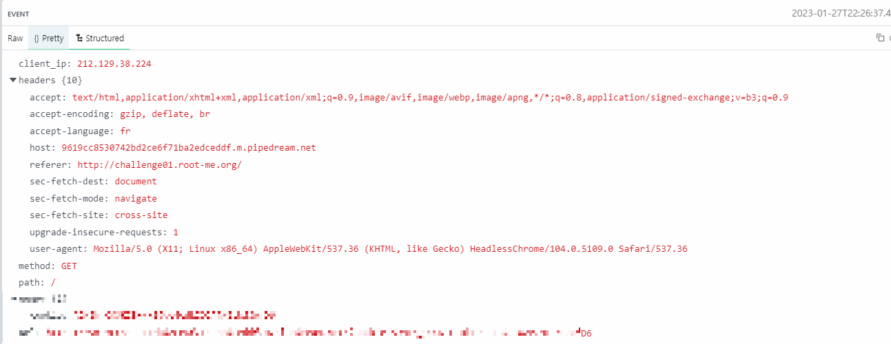 - 피해자가 해당 악성스크립트를 트리거했을 경우, RequestsBin에서 요청(Request)을 확인한다.