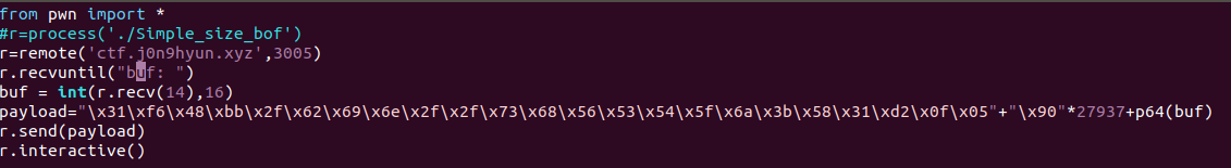 pwntools에서 지원해주는 recvuntil을 사용하여 buf: 문자열이 나올 때까지 문자열을 받아오고 buf에