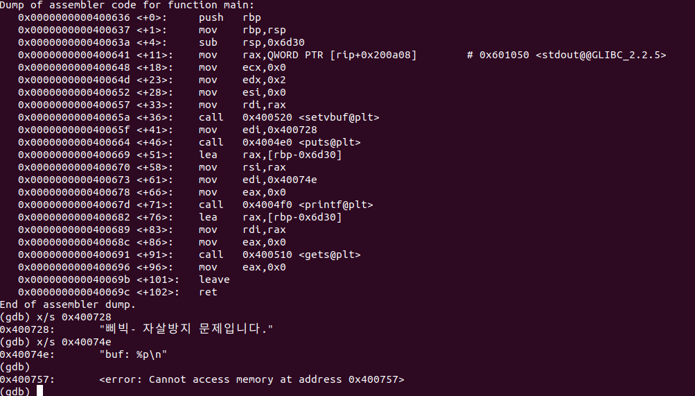시빅 - 자살방지 문제입니다.라는 문구가 출력되고 buf의 주소가 출력되는 듯하다