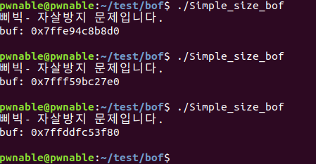 하지만 프로그램을 실행시킬 때마다. 버퍼의 주소가 계속 바뀌는 걸 볼 수 있다. ASLR기법이 적용되어있는 거 같다.