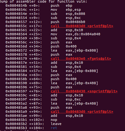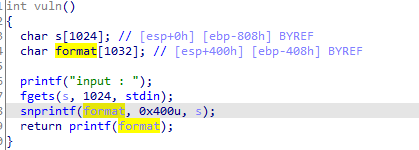 vuln함수를 살펴보면 fgtes함수를 통해 s변수에 1024바이트만큼 이력받고 snprintf함수를 통해 400u(1024바이트)만큼 입력받기 때문에 bof는 통하지 않는다 또한 s변수에 있는 값을 format에 옮긴 후 printf함수를 통해 출력한다