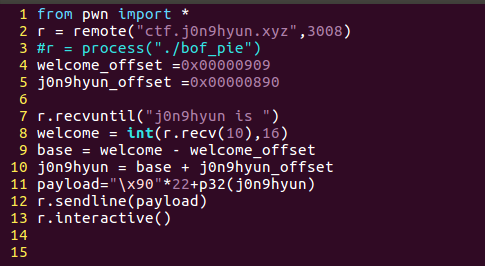 그 후 입력받은 welcome주소에서 welcome의 오프셋 값을 빼서 base주소를 구한다 그 후 base주소에서 j0n9 hyun의 오프셋주소를 더해서 j0n9 hyun의 주소를 구한다 그후 rsp까지의 22더미값을 채운 후 ret부분에 j0n9hyun의 주소를 넣어 실행시킨다