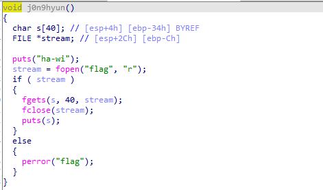 역시나 그렇듯 j0n9 hyun함수가 존재하고 fopen을 이용하여 플래그를 알려주는 것 같다.