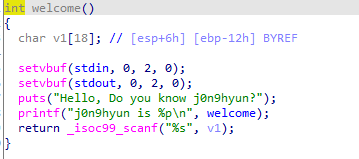 그럼 여기서 뭘 해야 하는지 감이 잡혔다 j0n9 hyun의 주소를 찾아 아래의 scanf를 이용하여 bof를 일으킨 후