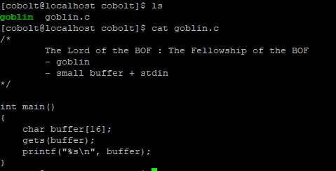 cobolt로 접속 후 ls-l을 확인 후 goblic 실행파일과 goblic.c파일을 확인하였다 그 후. c파일을 열어 프로그램을 소스코드를 확인하였다