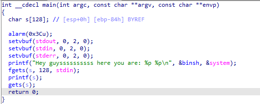 main 함수에서 binbs의 주소와 system함수의 주소를 출력해주고 fgets함수를 통해 입력값 검증과 함께 입력받을 수 있으며 입력값 그대로 출력되고 gets로 한번 더 입력받을 수 있다 이 부분에서 bof를 일으키고 printf에서도 포맷 스트링 버그가 일어나지만 해당 문제는 rtl을 통해 풀어볼 것이다.