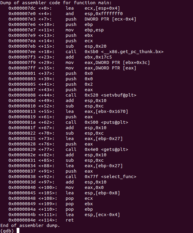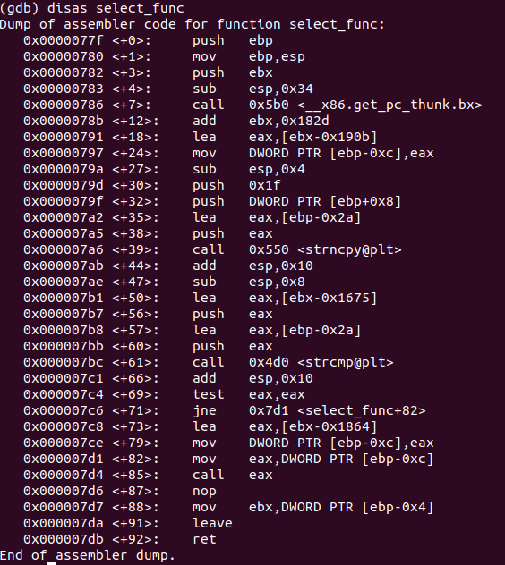 그렇다면 select_func 함수에서 인자값으로 넘어오는 값을 저장하는 부분인 ebp-0x2a에서 버퍼오버플로우를 일으켜