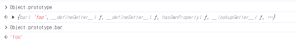 이와 같이 prototype을 통해 상속된 객체를 탐색하다 최상위 객체인 Object.prototype에 영향을 주게되면, 모든 객체에 속성이 포함되게 된다.