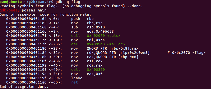 malloc를 통해 메모리 할당을 요청하고 rip+0x2 c0 ee5 위치에 0x6 c2070 <flag>를 한다 즉 해당 위치에 플래그를 넣는 거 같다. 그 후 그 값을 rdx에 mov를 통해 집어넣는다. 이를 확인하기 위해 해당 라인이 실행된 후인 39번 줄에 bp를 걸고 실행시켜 현제 rdx에 들어있는 값을 확인했다.