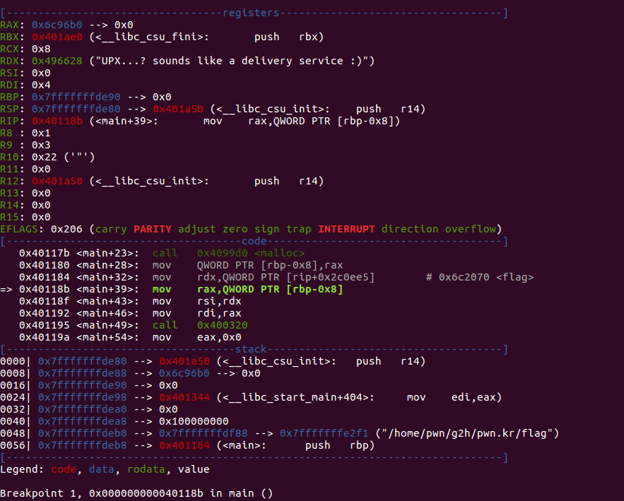 그 이유는 해당 문제가 upx가 걸려있기 때문이다 일단 upx를 해제하고 gdb로 분석해야 했다.
