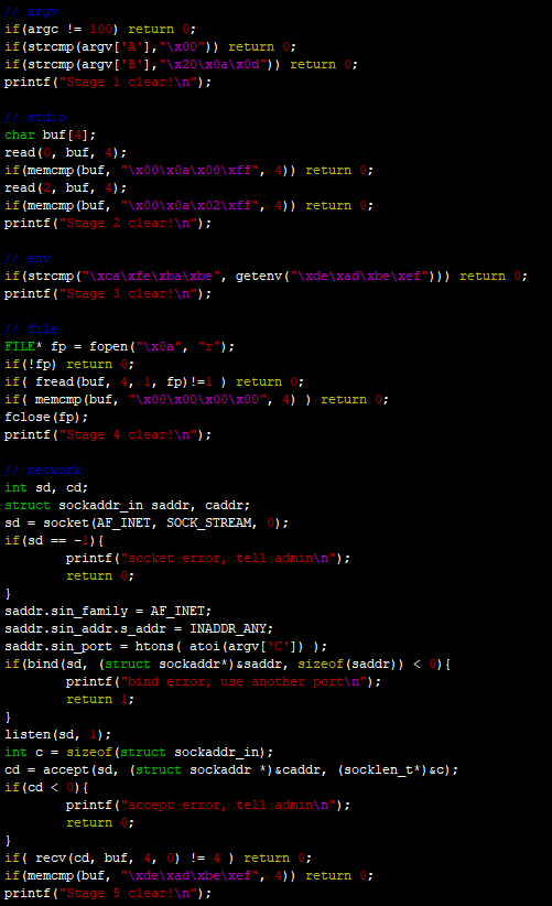 스테이지 1번은 argc의 개수가 100개 여야 하며, argv ['A'], argv ['B'] 즉 65번과 66번째 argv에 각각 \x00과 \x20\x0a\x0d가 입력되면 통과한다.