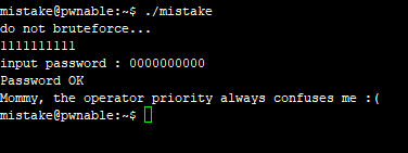 연산자의 우선순위는 =연산자보다 <연산자가 우선적으로 실행된다. 그러므로 0이 반환되어 fd에는 0(표준 입력)이 들어간다. 그 후 두 번째 if문에서 pw_buf변수에 pwn_len+1 즉 11만큼 입력을 받는다. 그 후 똑같은 크기만큼 pw_buf2에 값을 입력받고 xor함수로 xor연산을 한다 그리고 마지막 조건문에서 두 변수의 값이 같을 경우 플래그를 획득한다