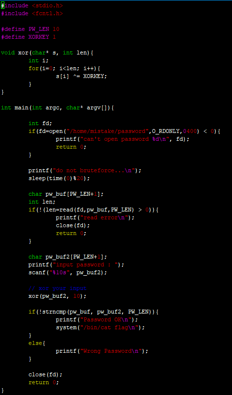 첫 번째 if문을 보면 fd=open을 통해 password파일을 읽기 전용으로 0400 권한을 준 후 < 0으로 비교하는 거 같지만