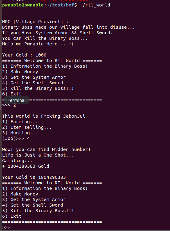 해당 프로그램을 보면 2번을 통해 돈을 벌고 3,4번에서 시스템 함수와 빈 쉘의 문자열을 찾을 수 있고 5번을 통해 우리가 원하는 입력값을 받을 수 있다. 2번에서 4번은 히든 번호?로 수많은 돈을 획득할 수 있다 이것은 IDA를 통해 찾았다.